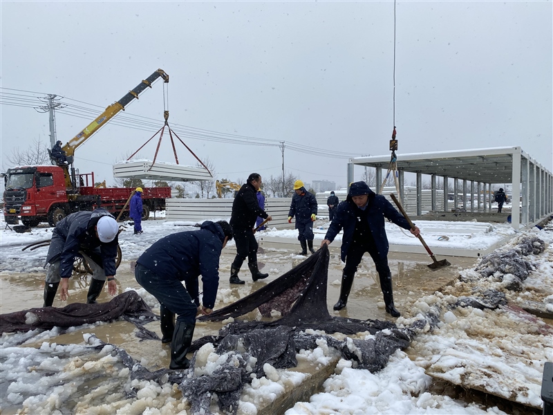 2月7日(農(nóng)歷正月初七),冬雪紛紛、寒風(fēng)瑟瑟,惡劣的天氣并未阻擋隔離點(diǎn)項(xiàng)目各參建單位的激情和干勁。中午12時(shí)40許,監(jiān)理單位在現(xiàn)場開展巡查,鰲峰建設(shè)在項(xiàng)目部組織施工會(huì)商工作。下午,國資集團(tuán)黨員突擊隊(duì)、志愿服務(wù)隊(duì)主動(dòng)請(qǐng)“戰(zhàn)”,步履匆匆赴現(xiàn)場鏟雪除冰。副區(qū)長王劍赴現(xiàn)場督查指導(dǎo)工作并對(duì)項(xiàng)目進(jìn)度表示肯定。