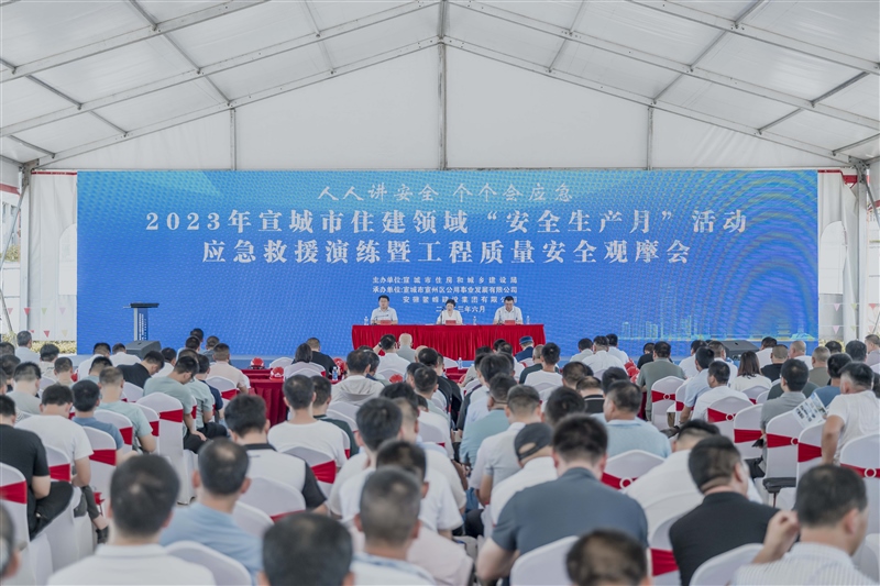 2023年6月28日,宣城市住建領(lǐng)域“安全生產(chǎn)月”活動應(yīng)急救援演練暨工程質(zhì)量安全觀摩會在我司高級技工學(xué)校建設(shè)項目成功舉行。市住建局主要負(fù)責(zé)人親臨指導(dǎo),全市各縣(市、區(qū))住建局、市質(zhì)監(jiān)站、宣城經(jīng)開區(qū)管委會、宣城現(xiàn)代服務(wù)業(yè)產(chǎn)業(yè)園區(qū)管委會市住建局下屬相關(guān)單位及全市各縣 (市、區(qū))部分建設(shè)、施工、監(jiān)理企業(yè)主要負(fù)責(zé)人、項目負(fù)責(zé)人共 300 余人參加觀摩活動。