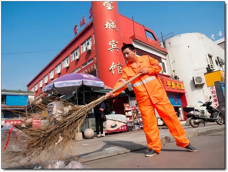 他每天早上四點多就準時出現在街頭,先是拿著大笤帚把街道從頭到尾普掃一遍,忙到上午八點多鐘,接著就拎著小掃帚和簸箕定點清掃。到了下午兩點鐘,他會再把整條街普掃一遍,一直要忙到五點多才能下班。大熱天里,他身上的衣服經常是濕了干、干了又濕,白色的鹽漬積了一層又一層,他卻全然不顧。